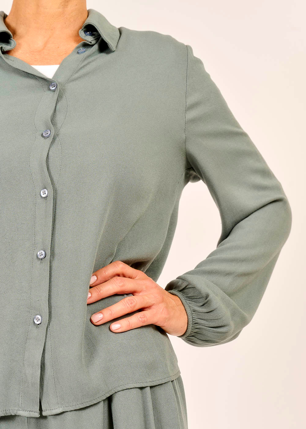 Diese Bluse vereint schlichte Eleganz mit müheloser Leichtigkeit – der fließende Stoff umschmeichelt die Silhouette und sorgt für ein angenehmes Tragegefühl. Mit ihrem zeitlosen Schnitt und den feinen Details wie den dezenten Knöpfen lässt sie sich vielseitig kombinieren – ob lässig zur Jeans oder edel zum Rock. Zusammen mit einer passenden Hose bietet sie eine moderne Alternative zum klassischen Anzug. Ein Must-Have für alle, die Komfort und Stil auf harmonische Weise verbinden möchten.